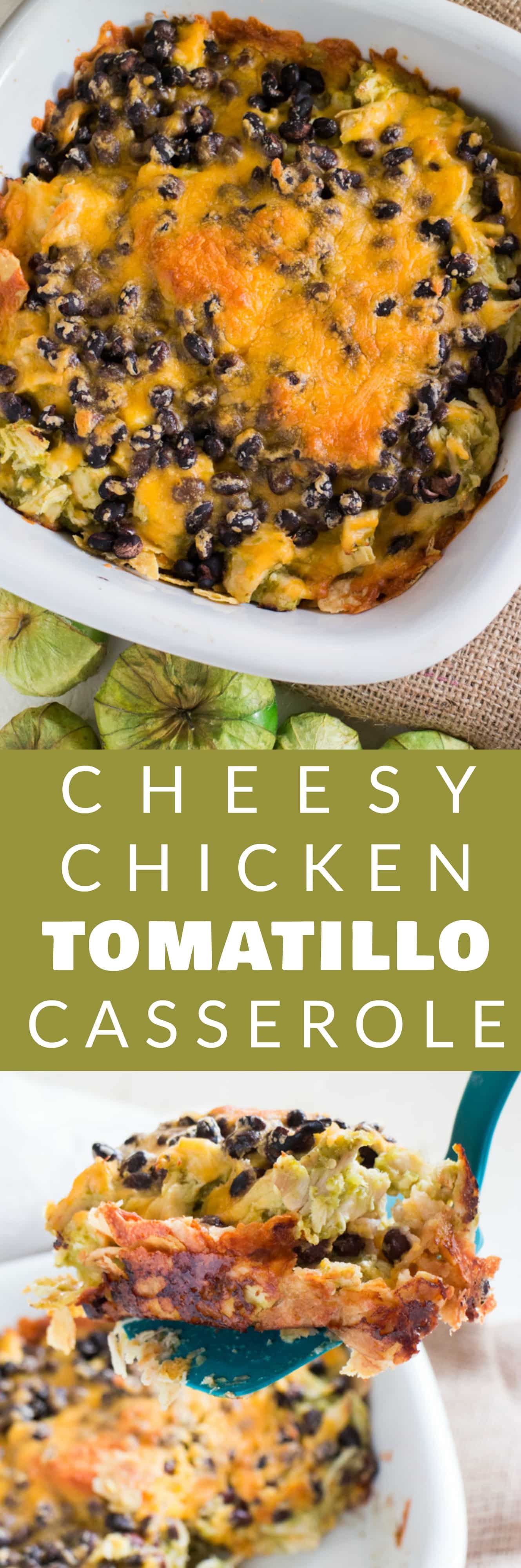 CHEESY Chicken Tomatillo Casserole recipe! This easy dinner Mexican casserole uses 1 pound of tomatillos to make a creamy sauce that is layered with tortilla chips, chicken, black beans and cheddar cheese! I love to make this simple dish when my garden tomatillo plants give me too much and I’m left asking asking “What to do!”.